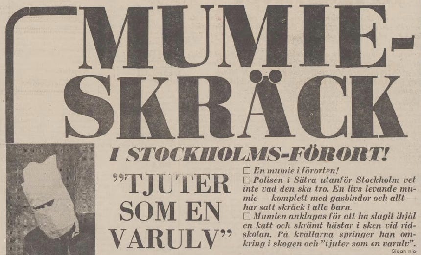 Och om du trodde att varulvarna var det märkligaste som kunde dyka upp i Sverige – då har du inte hört talas om mumien. Japp. En mumie, mest för att den känns så fullständigt malplacerad i just gamla Svedala. Mumien strök omkring i Sätra – ännu en förort till Stockholm. Men den här gången skulle det dröja till mars 1973 innan monstervågen återigen bröt ut, bland både barn och vuxna.