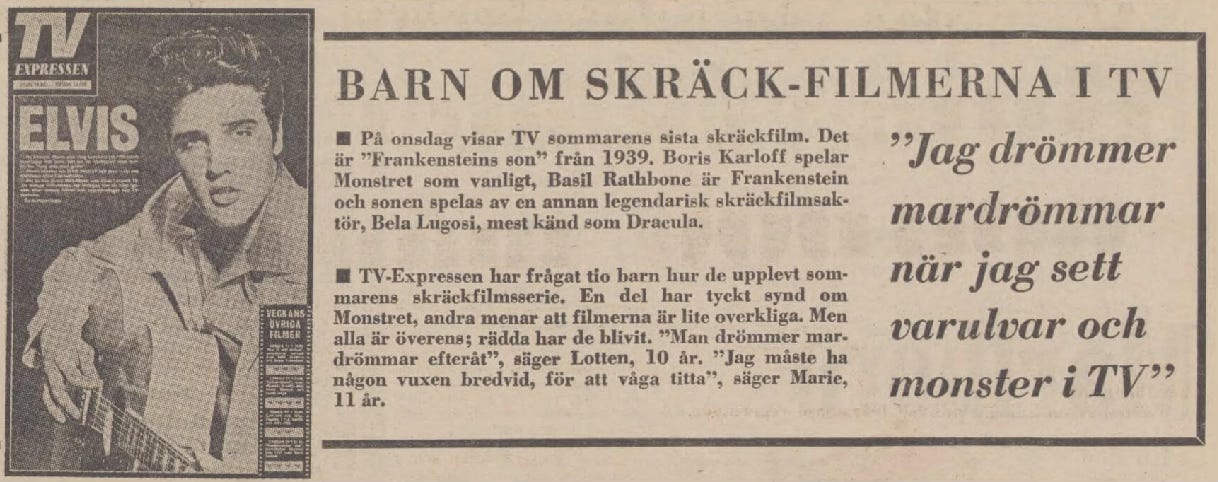 Men så kommer en liten detalj som är lätt att glömma: under sommaren 1972 visade SVT (eller TV1, som det hette då) något som kallades Skräcksommar – ett skräckfilmsmaraton med gamla Universal-klassiker. Vi snackar: